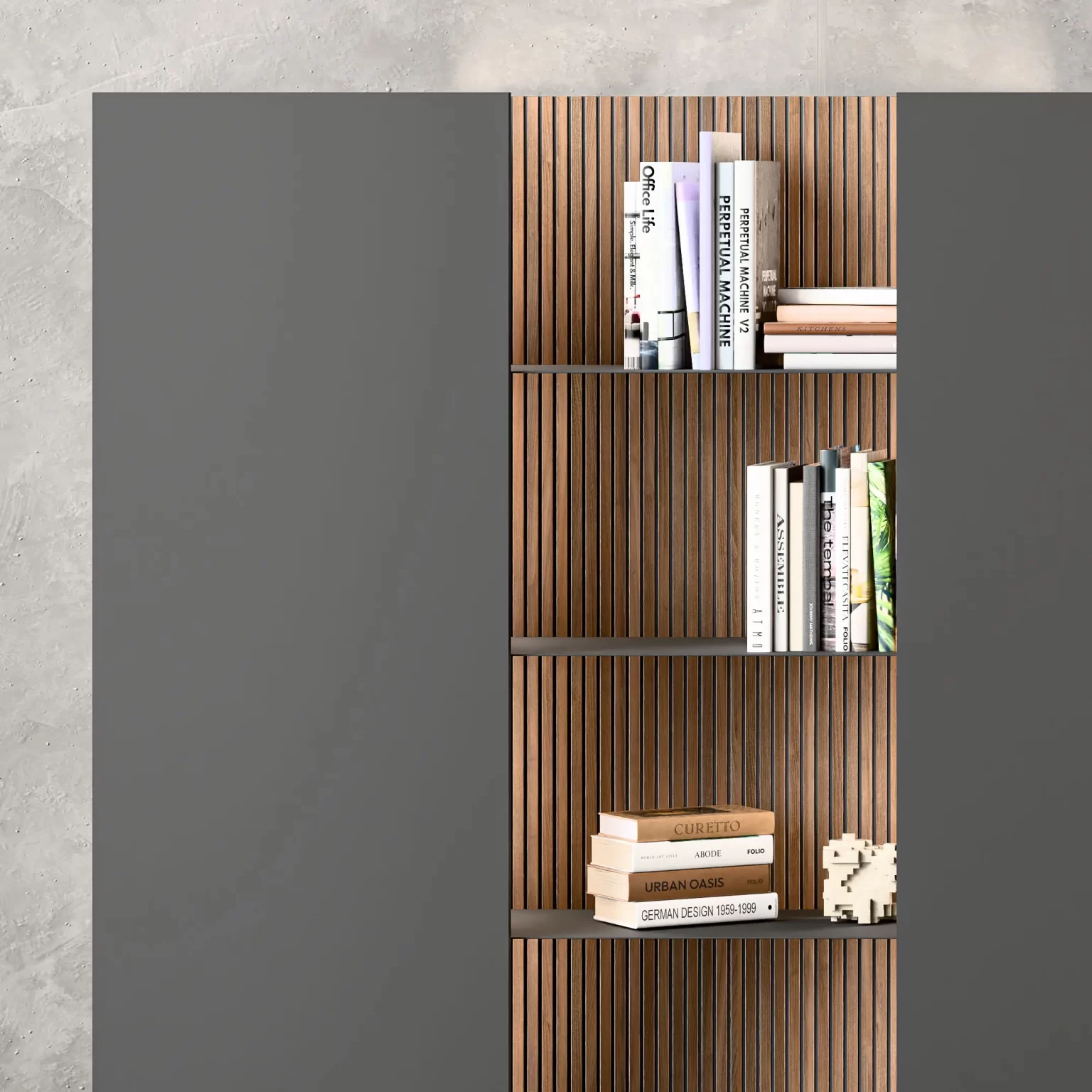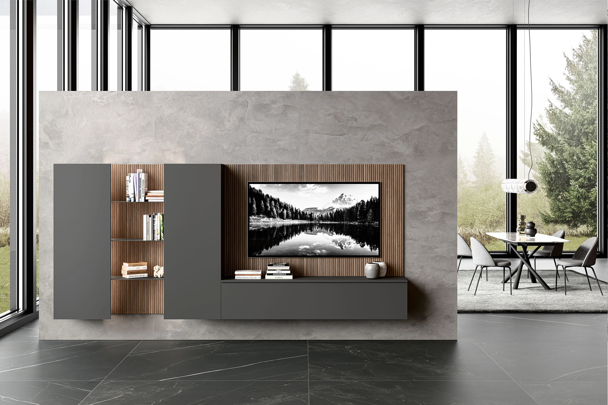 La boiserie Era è pensata per valorizzare il living: il rivestimento dogato in cannettato noce dona ritmo e continuità allo spazio, creando un effetto elegante e raffinato che richiama una superficie preziosa.