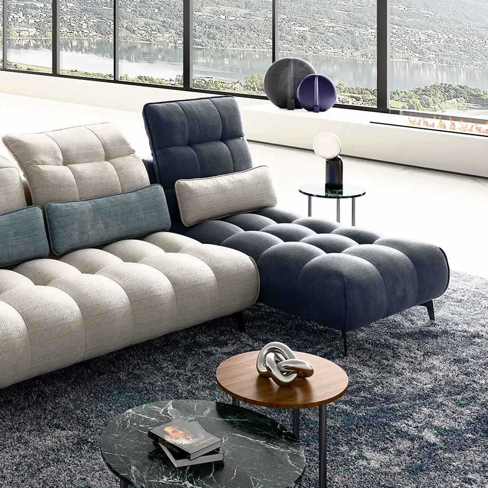 Divano moderno con schienale traslante per seduta regolabile a doppia profondità dotato di meccanismo avance-recule. Ampia chaise longue, cuscino lombare, trapuntatura effetto nuvola. Piedini alti in metallo canna di fucile, cromato o marrone. Disponibile in pelle, tessuto e microfibra. Design contemporaneo componibile per living moderni.