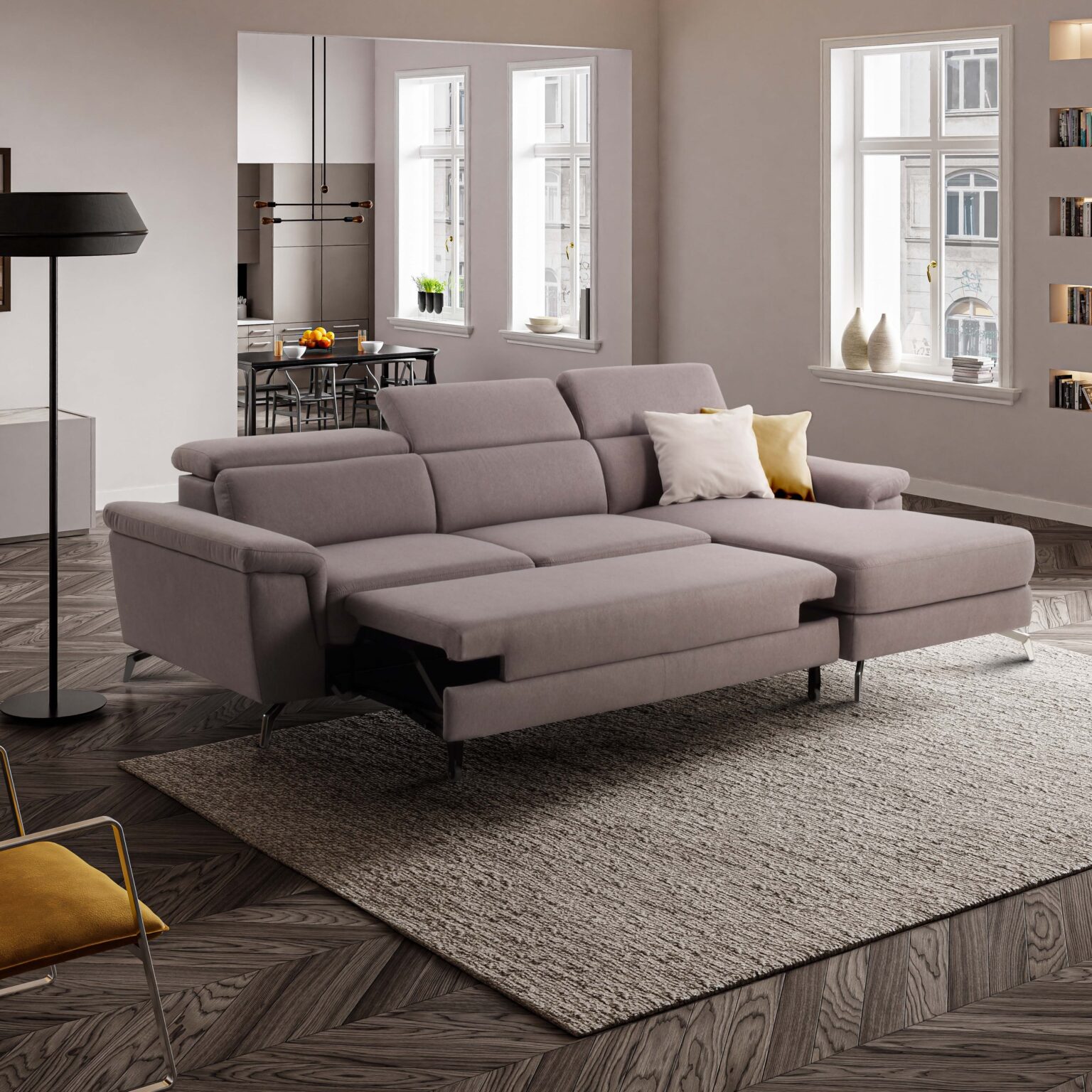 Seduce per design e comfort già a prima vista, lo si apprezza per la generosità della seduta, per il piacevole supporto lombare, per i comodi poggiatesta regolabili e soprattutto per un semplice meccanismo manuale che consente di estrarre una panchetta a scomparsa. Su questa ci si può rilassare totalmente.