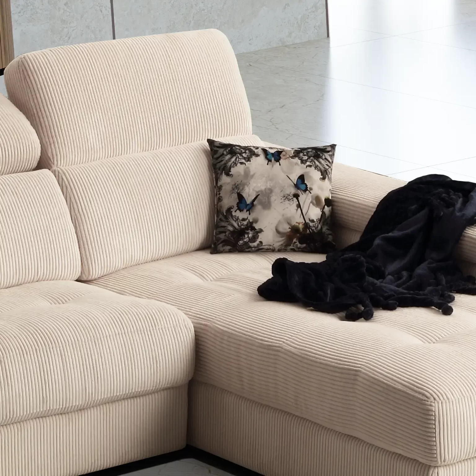 Il rivestimento in velluto a coste color Milk aggiunge luminosità e si adatta con disinvoltura a palette neutre o più decise. Mirò è un divano modulare comodo, versatile, adatto a chi cerca funzionalità evolute e uno stile che resta attuale nel tempo.