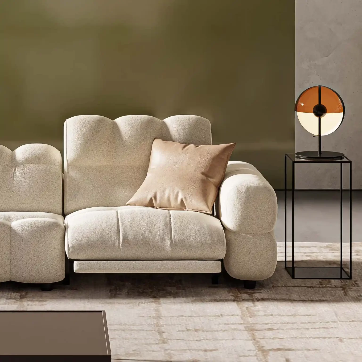 Ispirato alle forme delle auto sportive americane, il divano Roadster è elegante nel suo dinamismo. I volumi morbidi si ritrovano nei poggiatesta, nei braccioli e nei frontali delle sedute, modellati da grandi sbuffi che aggiungono carattere e fluidità visiva. La struttura modulare si presta a composizioni personalizzabili, affiancando alle sedute due pouf – in dimensioni diverse – da integrare oppure utilizzare in modo indipendente.