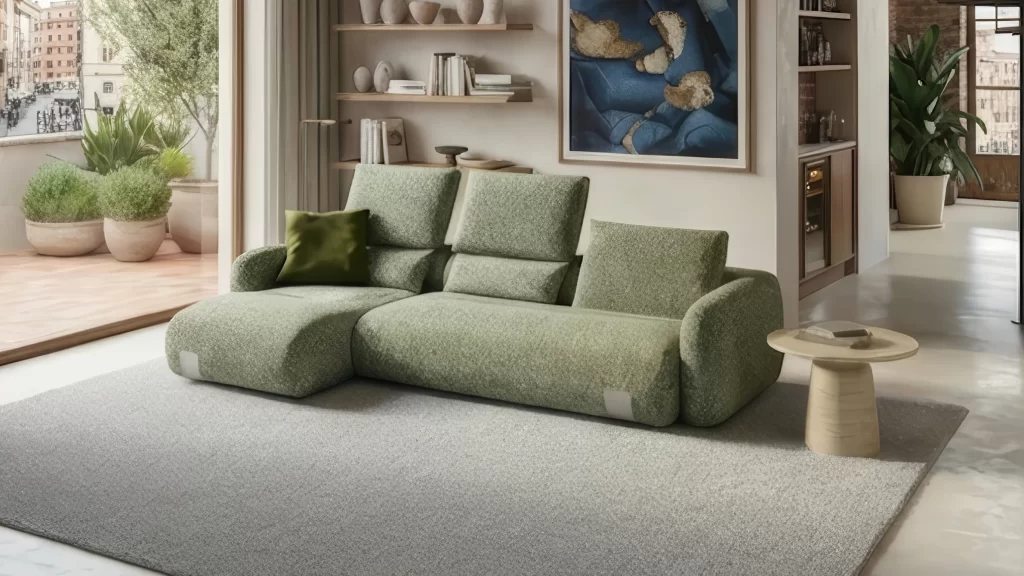 Divano altamente componibile con seduta scorrevole e cuscini schienali regolabili in altezza firmato dall’architetto Maurizio Manzoni