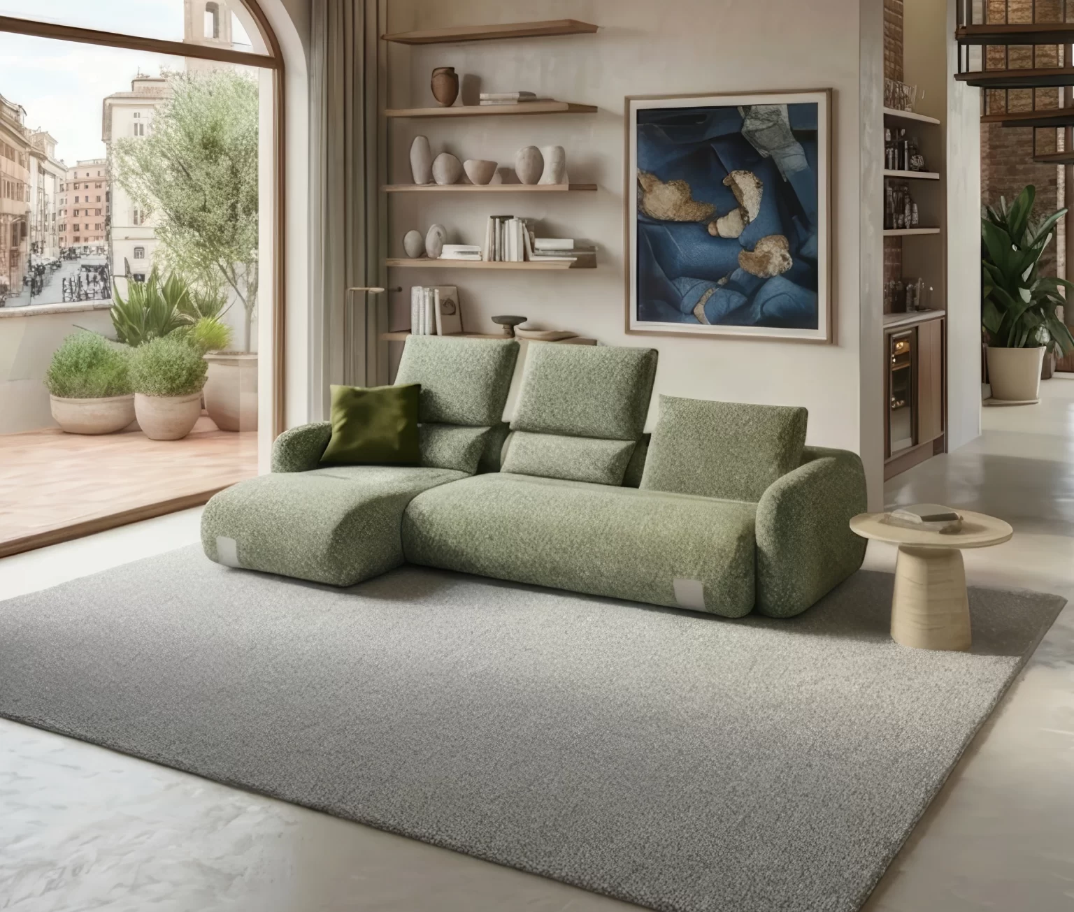 Ampia componibilità con tavolino a spicchio per composizioni dinamiche