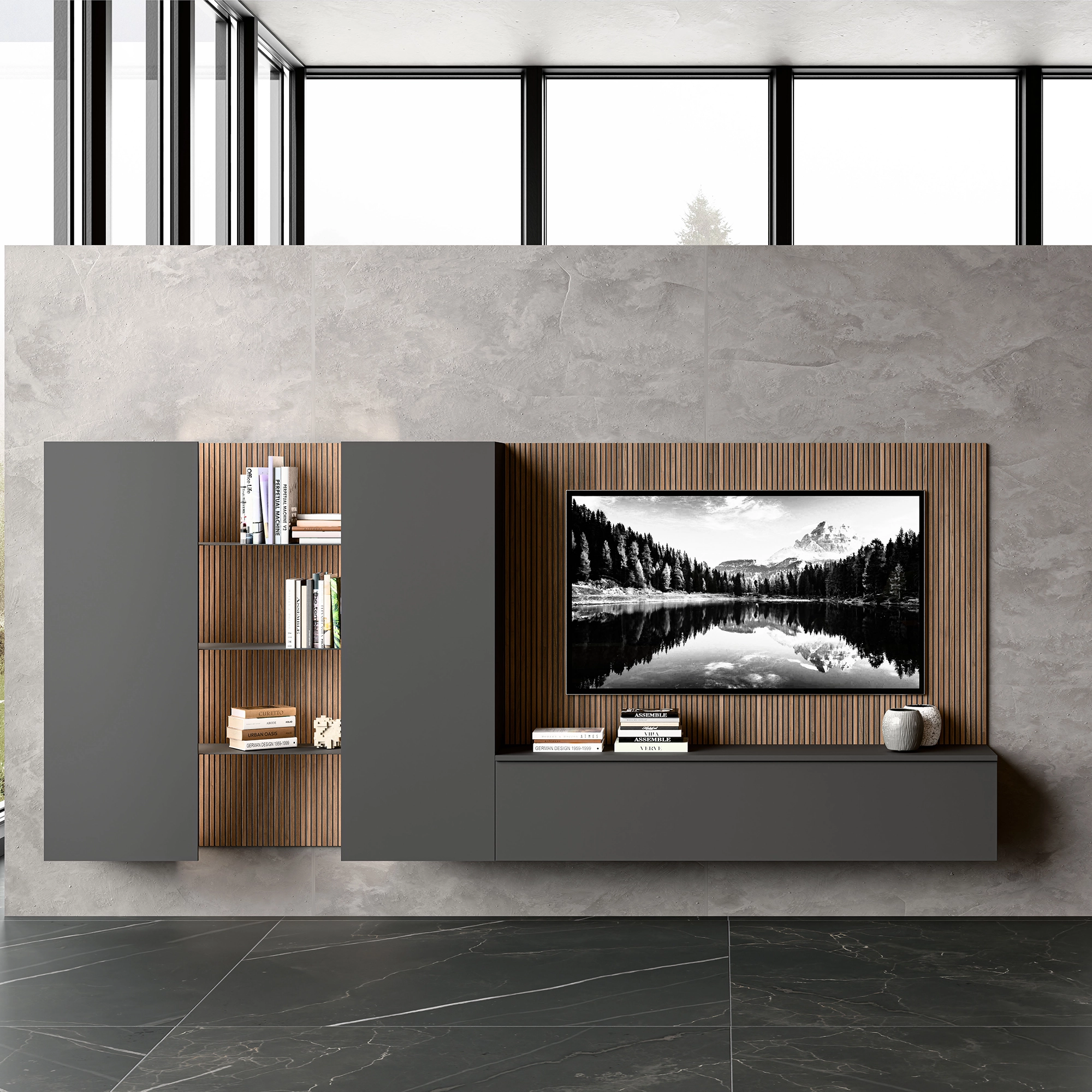 Living Collezione Spazio Composizione Zeus misura cm 330 profondità cm 52/40, finitura melaminica vari colori, elemento centrale metallo verniciato colore ferro